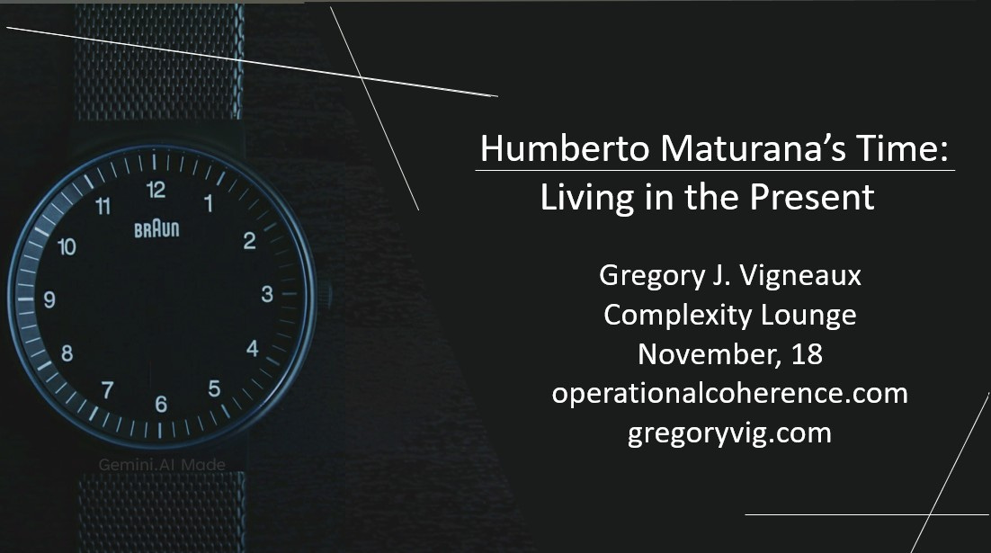 In August, I posted a shorter piece on Maturana’s time that I then posted to LinkedIn, which fortunately caught the attention of the Complexity Lounge and resulted in an invitation to come speak on the topic. I had delivered a talk in 2021 at the Complexity Lounge titled “Framing Complex Systems: Reality, Language, and Flow,” so this would be a most welcomed return to the community. I was excited to have the opportunity to present again, this time on Maturana’s time. I find time to be an interesting subject, and as I have been studying Maturana for years, it was natural that the two came together. Maturana’s writing on time is not extensive; it includes a letter of acceptance, which has received valuable commentary, and one journal article from 1995. The rest is scattered throughout his works. This talk is not an exhaustive look at everything Maturana wrote about time, but a selection of excerpts that create a complete talk on cultural and biological time.