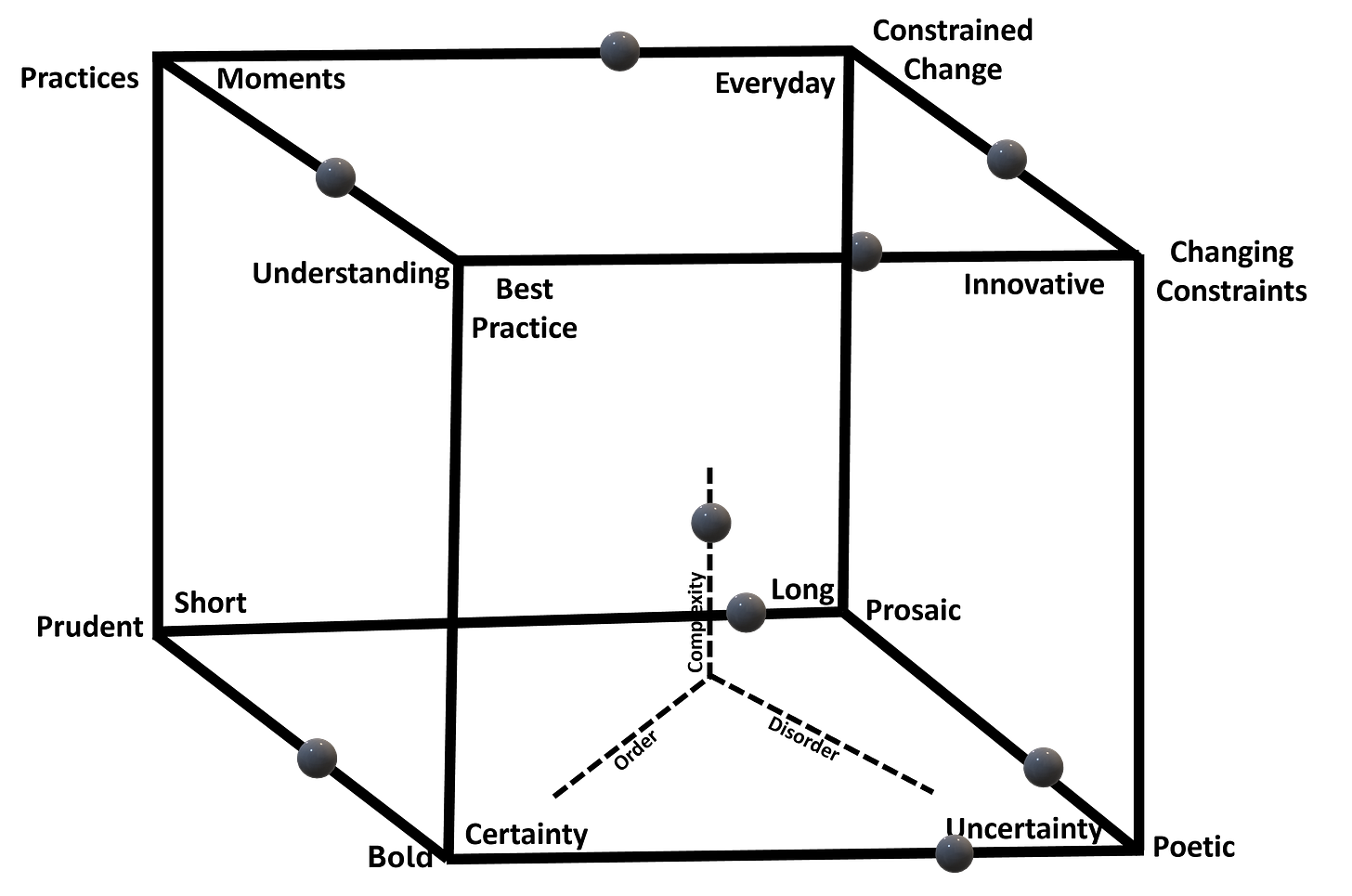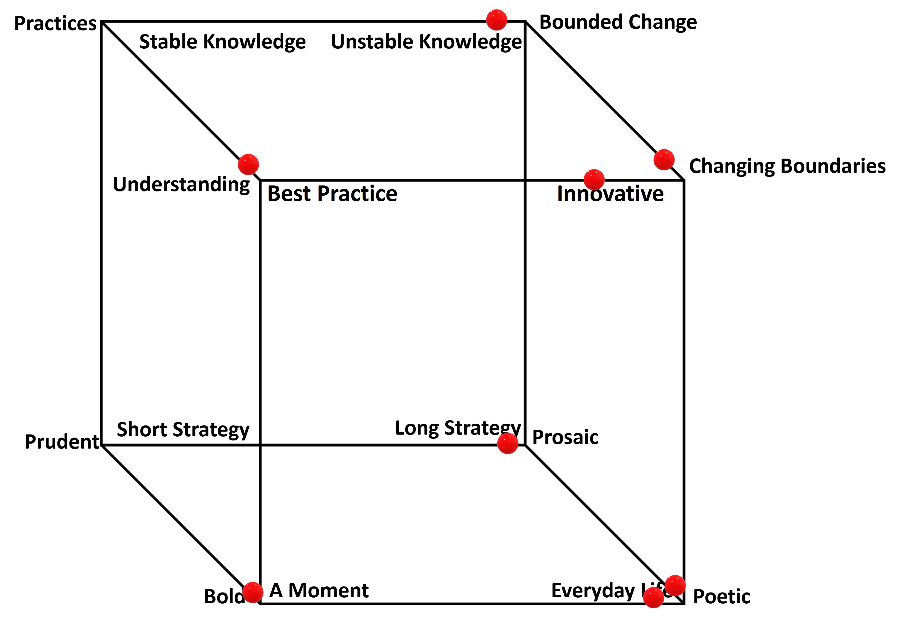 The EidosCube, shown below, has been populated to be a moderate strategy with knowledge certainty, duration, and the dimension of style taking the most extreme positions, while the remainder are relatively balanced. As the EidosCube and its dimensions are unpacked in the list below, the EidosCube gives form to the design of the strategy and what it is intended to accomplish, and how, and the predominant nature of the environment in which this work will take place, which is represented as complex.