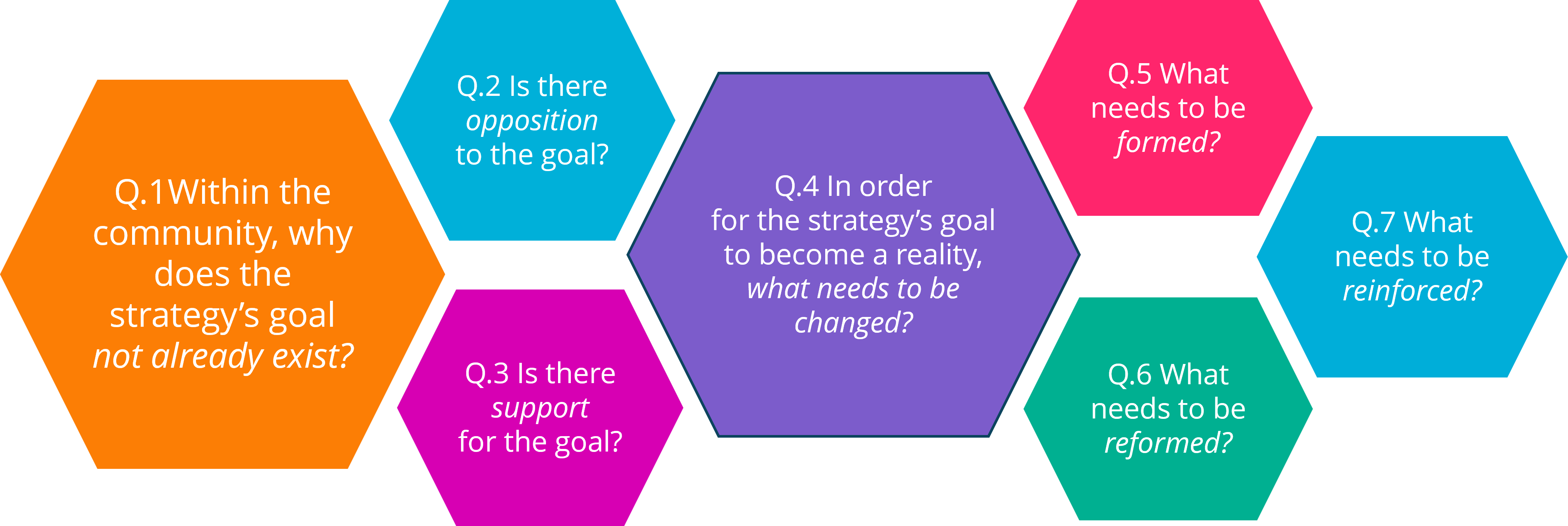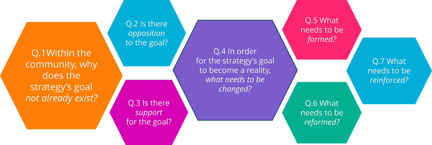 There is a designed flow of the questions that guides the user through sense-making concerned with why the strategy’s goal is not already present in the community, asking further if it is due to opposition, and also seeking support for the goal, before the tools asks what would need to be changed for the strategy’s goal to become a reality, with three follow up questions asking what needs to be formed, reinforced, and reformed. SenseCraft’s seven questions are significant and may lead to new, additional main and sub-questions in the course of strategy implementation, which would be an effective use of the tool. As it is presented here, SenseCraft is a vital, core beginning to the implementation process.