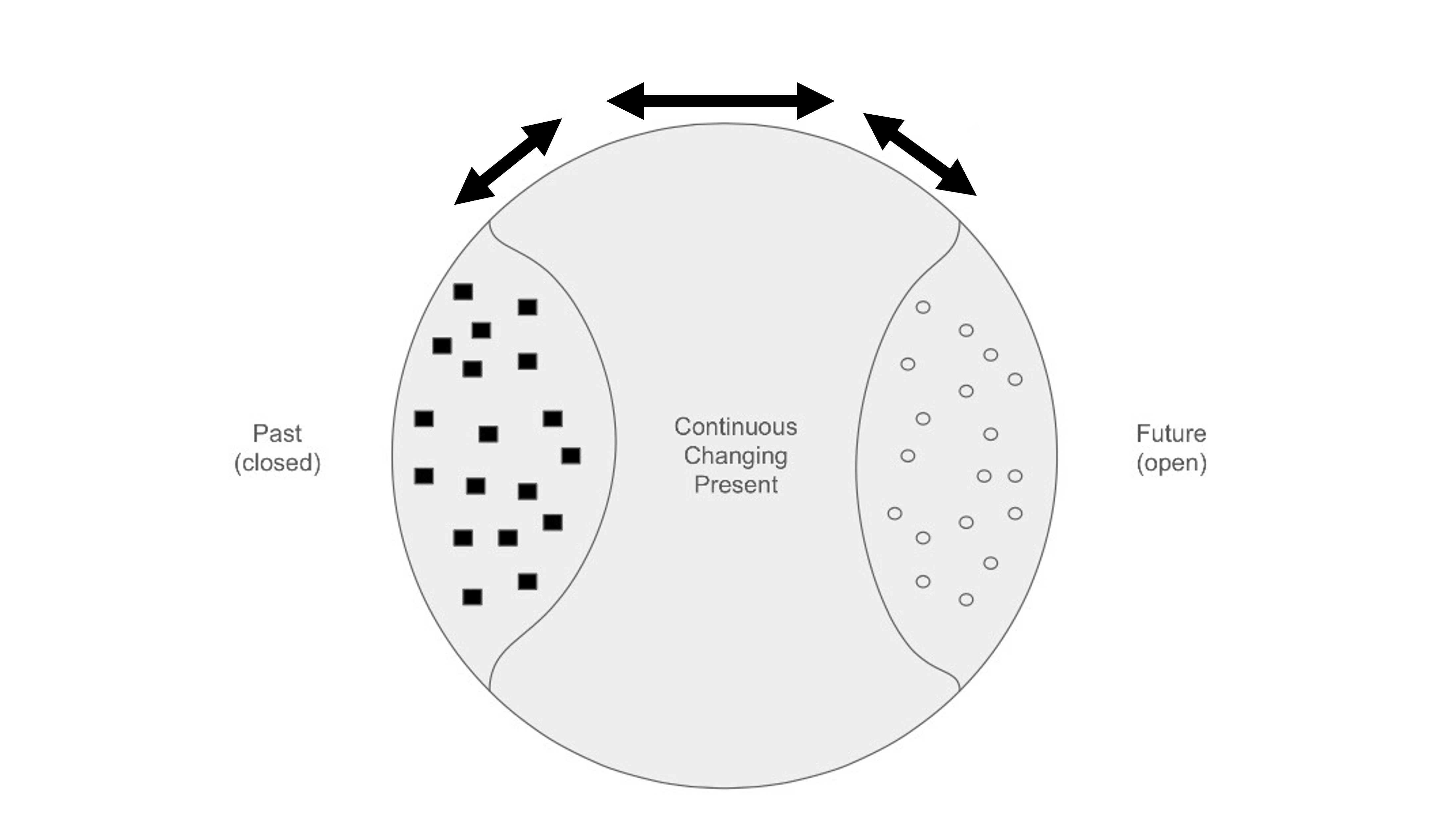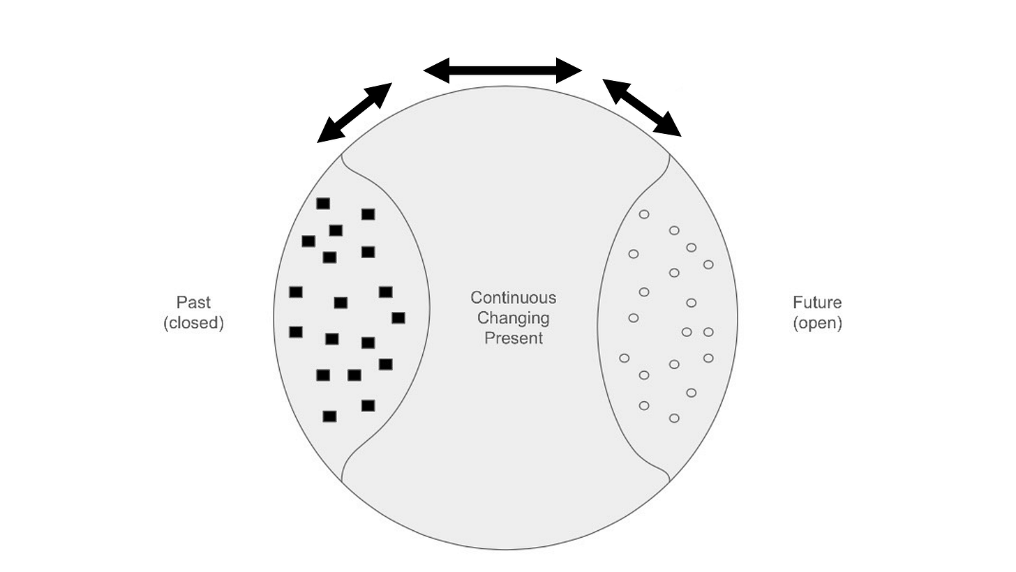 Maturana (2008) writes, “We human beings exist in the present, in a continuously changing present, the past and the future do not exist as such, and they are manners of being now, in the present” (p.2). As it is adapted to fit zero time here, in the continuously changing present, the past is an explanation of how the present arrived. Maturana (2005) explains: “We invented the notion of past as a negative dimension in the imagined space that we call time to be to be able to explain how is it that we become as we are at any moment in the flow of our continuous change in our here and now” (p.60). The size and significance of the past and future are relative to the breadth of the continuously changing present being observed and considered in zero time and its velocity, complexity, and chaos.